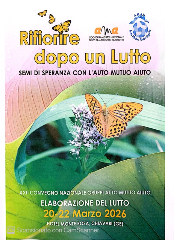 Ogni anno viene organizzato il Convegno Nazionale dei Gruppi di Auto Mutuo Aiuto (A.M.A.) al quale intervengono le Associazioni di Volontariato, tra cui noi, e diversi professionisti sensibili nei confronti dell'esperienza del lutto nelle sue varie declinazioni. Si tratta soprattutto di un tempo e uno spazio per la condivisione, un'occasione unica di apprendimento tra pari e professionisiti delle varie relazioni d'aiuto. Negli anni si è costituita una rete che sfiora il centinaio di realtà locali dove alcune migliaia di persone, creando legami, hanno aiutato ad affrontare il dolore della perdita. Il Convegno è itinerante, organizzato di volta in volta dagli affiliati dei Gruppi A.M.A. e quest'anno si svolgerà a Chiavari (Ge) dal 20 al 22 marzo.